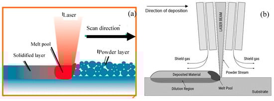 Additive manufacturing systems are divided into two broad categories; (i) powder bed systems and (ii) powder/wire feed systems [32]. In the powder bed systems, a powder bed is created by spreading powder across the building platform area. The energy source (electron beam or laser beam) delivers energy to the surface of the powder bed and melts the powder into the desired shape according to the CAD file (Figure 1a). Afterward, the new powder is spread out across the work area again, and the process is repeated to produce a solid three-dimensional component. The advantages of this system include its ability to create high resolution features, internal channels, and maintain dimensional control [33]. Whereas, in the powder or wire feeding systems, the material is delivered directly into a melt pool that is generated by a heat source on a substrate or previously deposited layers. These technologies are based on a process where the laser beam melts an alloy added onto a substrate. In particular, the delivered material and a layer of the substrate are fused using a laser beam (Figure 1b). This melting process ensures a metallurgical bonding between layer and substrate. The capability to produce fully dense, as well as gradient objects, makes the DED more attractive, concerning the powder bed systems, in the manufacturing of large and/or functionally graded components.