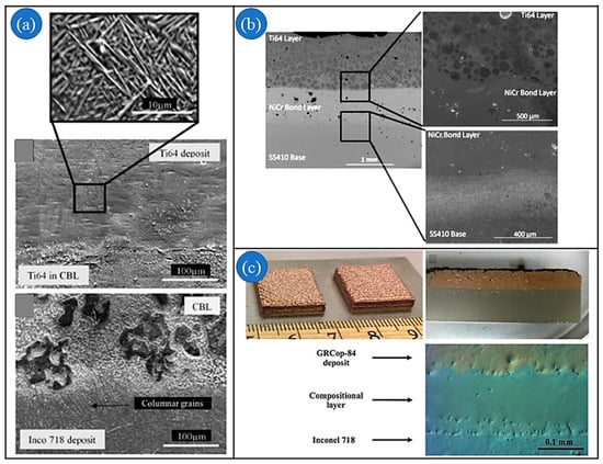 (a) SEM images of the Interface of the as-built bimetallic structure of Ti-6Al-4V and In718 [63], (b) Cross-Sectional SEM image of Ti-6Al-4V bonded to SS410 processed using LENS™ [64], (c) as-fabricated bimetallic structure of In 718 and copper [65].