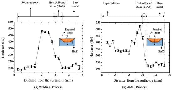 The hardness of cast iron parts repaired by using (a) traditional welding process and (b) Additive Metal Layer Deposition (AMD) process [77].
