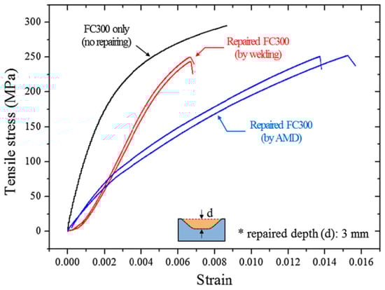 Tensile stress-strain curve of a cast-iron repaired via a traditional welding and DED process (AMD in the figure) [77].