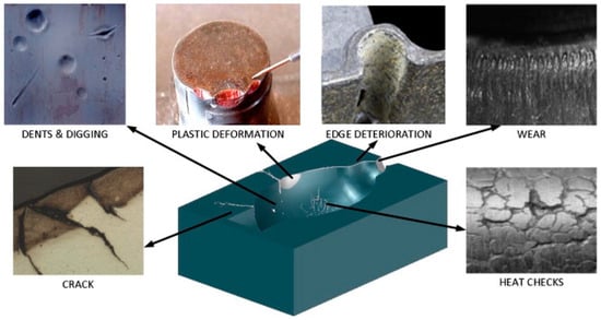 One of the most important steps in the manufacturing of dies and molds is materials selection that is also very important from the economic point of view. Indeed, it is found that materials selection has a direct effect on the life and cost of molds and dies. Nonetheless, in the production of dies and molds, both design aspects, such as ductility, fatigue strength toughness, wear, and corrosion resistance, and aspects related to the manufacturing like hardness, polishability, machinability, dimensional stability should be also considered [92]. Different materials under different working environments behave differently and have multiple types of failure. Substantially, change in the dimensions, geometry, and materials properties of the dies during the working condition would negatively affect their performance and lead to failure. Different sorts of defects in dies and molds are shown in Figure 7. It has been revealed that the lifetime of these components are shorter than the expected life, and many of these defects appear in a shorter time than the anticipated period. Therefore, from the economic point of view, it is believed that restoration and remanufacturing is an interesting solution to recover the dies and molds [93].