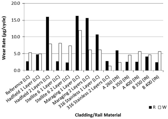 Rail maintenance and substitution is a significant fraction of expenses of running a rail network. Wear and rolling contact fatigue (RCF) are the main defects that can reduce the lifetime of rail tracks. Switches and crossing are the main parts that can undergo wear, and it is found that their maintenance costs are 330 times higher than straight tracks on a per meter basis [97]. It is known that their wear and RCF properties can be improved via some surface treatments like case hardening, peening, or surface coating. For this reason, DED is of great interest to be used as a coating method to weld different materials on the top of the running surface of the substrate. In fact, through DED process, it would be possible to deposit a wide range of beneficial materials, i.e., alternative steels of hard facing alloys, on areas of the tracks prone to wear and/or RCF. Lewis et al. studied the wear properties of repaired rail disks with various materials and have found that wear behavior of rail track was not always improved after depositing a coating layer by DED. Figure 8 compares the wear rates of the repaired disks after 5000 cycles. As can be seen, stellite showed the lowest wear rate with an average of 0.18 μg/cycle in comparison with the as-built sample with 1.59 μg/cycle [97]. On the contrary, the least consistency in the wear rate and the highest wear rate was revealed with the Margining and Stainless steel coatings. Also, Clare et al. and Lewis et al. investigated rail track repairing using DED process [83,97]. According to their research, the expense for maintenance of some components, such as switches and crossings, is very low for the straight track parts, and therefore, it is highly recommended to repair those simple geometry components instead of replacing them.