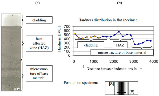 (a) Microstructure, (b) hardness distribution and location of both in DED flat specimen (bottom, the Starting point (S), Endpoint (E)) [86].