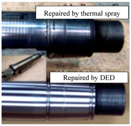 A drive shaft repaired by thermal spray (top) and DED (bottom) processes [87].