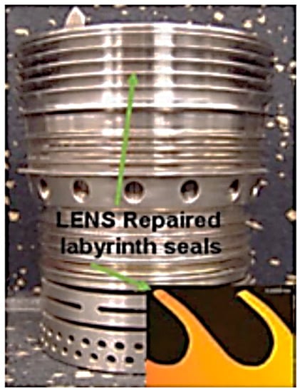 Maintenance and repair of aero-engine parts, such as gas turbine, low and high-pressure turbine blades, and so on, are of the critical concerns in aerospace industries as a consequence of the increase in the raw material and manufacturing costs. Gas turbine Inconel® 718 compressor seal is a critical and high-value component that can be repaired using the DED process. The application of this seal in the gas turbine aims to prevent gas leakage in gas turbine engines. In this component, the main damage is the excessive wear in the labyrinth seal that negatively affects the performance of the gas turbine. Figure 13 shows a very finesse repair of a damaged gas turbine compressor seal [87].