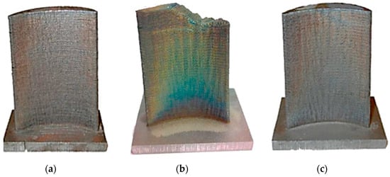 (a) Turbine blade produced by DED process, (b) damaged turbine blade, (c) restored blade by DED [18].