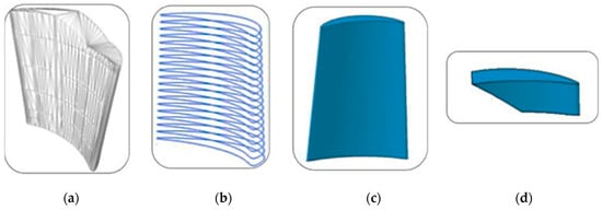 The process of finding a parameterized geometric model required to repair a turbine blade developed by Wilson et al. is schematized in Figure 15. In this model, firstly the point clouds of the damaged blade were acquired and meshed (Figure 15a). After that, the Prominent Cross Section (PCS) algorithm was run on the mesh surface and the resulting PCS data, lying strictly over the non-defective region of the blade, was imported into a software. In this software, the PCS points in the non-defective area were read and used for the construction of splines that represent incremental blade cross-sections of the non-defective area (Figure 15b). Afterward, a solid body was built from the resulting combination of surfaces (Figure 15c). Once the extrapolated surface was created, a Boolean (Figure 2) operation was executed to extract the difference between the reconstructed blade and the original meshed surface of the defective blade model, leaving us with the desired repair volume, as shown in Figure 15d [18]. Ultimately, Wilson et al. demonstrated that the DED process lent itself to repair high-value parts in an environmentally friendly manner. Moreover, their outcomes confirmed the effectiveness of DED process in the repair and remanufacturing of a wide range of damages.