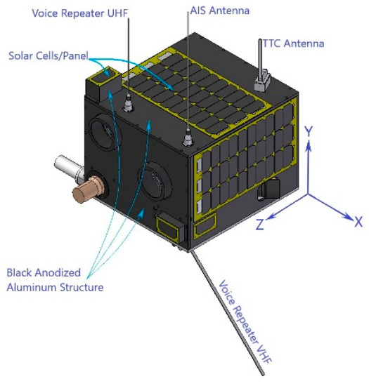 Specifically, in Indonesia, the space-based AIS has been installed on LAPAN-A2 microsatellite and was launched successfully in September 2015 [12]. This satellite has been developed and operated by National Institute of Aeronautics and Space of Indonesia (LAPAN) until the present day. This satellite was equipped with a space-based AIS module capable of collecting vessel messages from about 650 km altitude with a 6-degree inclination. The LAPAN-A2 microsatellite is a unique satellite since it was placed in equatorial orbit; hence, it is capable of monitoring Indonesian maritime territory and other equatorial countries 14 times a day. This condition is in line with the purpose of installing the AIS system that is to monitor vessel activity crossing Indonesian waters. Therefore, for Indonesia, which consists of 5.8 million square kilometers of marine territory, the existence of this satellite is beneficial, especially in terms of maintaining maritime surveillance. Besides space-based AIS payload, Automatic Package Reporting System (APRS), Voice Repeater (VR), and multispectral camera were also installed to this satellite in order to support amateur communication and remote sensing purpose [13]. The illustration of the LAPAN-A2 microsatellite and its mounted payloads is provided in Figure 1 below.