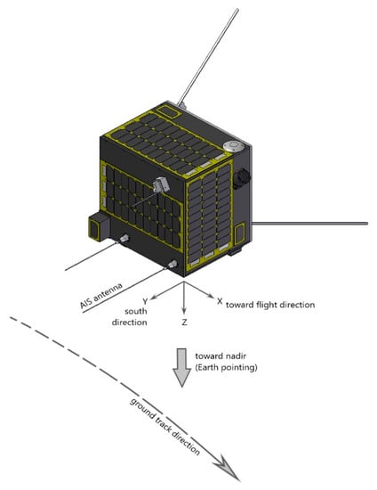 In this study, satellite maneuvering has been performed in order to orient the AIS antenna to the desired angle so the antenna will tilt 135° or 180° from the nadir axis. As depicted in Figure 4a, the flight configuration of nadir pointing is defined as a nominal condition. In this nadir pointing, the AIS antenna (that is placed on the y-axis) is oriented into south direction or 90° from its nadir axis. Based on Figure 4b, the spacecraft made a −90° maneuver on the x-axis and then −45° on the z-axis so the AIS antenna will tilt 45° from the flight direction or 135° from nadir. In the second setup (Figure 4c), the spacecraft only took a single −90° maneuver on the x-axis in order to orient the antenna 180° from the nadir axis. This orientation was chosen by considering that the different angle of monopole antenna could give different reception AIS signals from the ground.