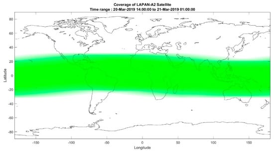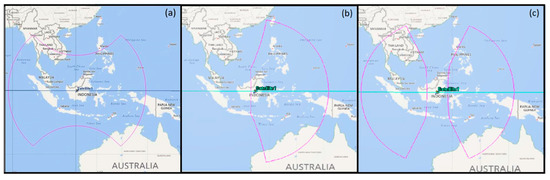 Based on our simulation, as provided in Figure 7 above, the 11-h duration, approximately 7–8 satellite passes, is enough to cover all the possible areas. Therefore, besides the power limitation issue, the 11-h maneuvering duration was also chosen because this duration gives enough time for the AIS receiver to receive all the vessel messages transmitted from the possible coverage area. In other words, in case the two sets of the observation cannot be performed, one set of observations can be used to produce valid analysis. In our case, the second observation is used in order to provide more complete datasets for analysis purposes.