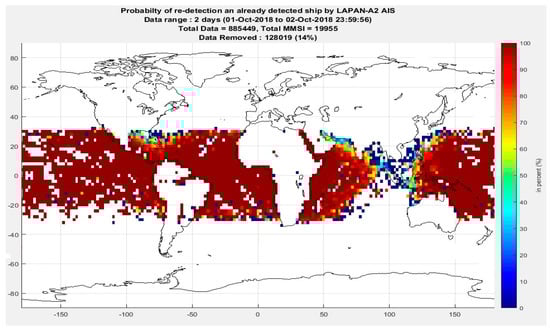 Figure 8. The re-detection probability of LAPAN-A2 AIS generated using dataset acquired on 1 October 2018, 00:00:00 UTC to 2 October 2018, 23:59:56 UTC.