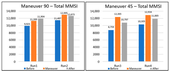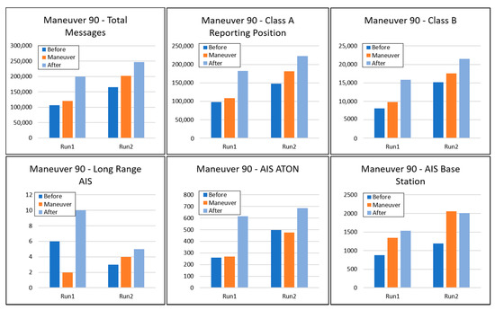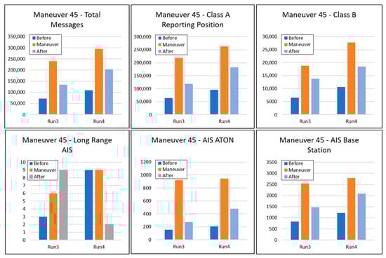 The resulting activity of before, during, and after the 90°-maneuver and 45°-maneuver, respectively, is shown in Figure 9 and Figure 10. Those figures consist of the comparison of total AIS messages and each categorized message according to Table 2 excluding Class A static and other messages. The exclusion of those types of messages is due to its low reception performance resulting in none of the received messages.
