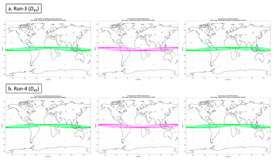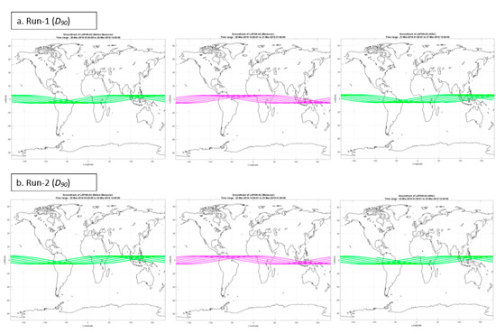 Based on Figure 10, it is confirmed that the performance of an AIS receiver during the 45°-maneuvered increases significantly compared to before and after the maneuver, except for Long-Range AIS messages type. For Long Range AIS on Run-3, although the 45°-maneuvered is capable of receiving a higher number of messages than before the maneuvering, this reception is still lower compared to after the maneuvering. On Run-4, the message reception of Long-Range AIS before the 45°-maneuvered is similar to the message reception during the 45°-maneuvered. We believe that the exception for Long Range AIS is caused by the small order of the number of received messages. Therefore, there is not enough data to make a statistically relevant conclusion. Excluding the Long Range AIS, the total number of messages received by making 45°-maneuvered increases around 31.11% to 239.29% compared to before and after the maneuver. One might have assumed that the increasing AIS message reception during the 45°-maneuvered and 90°-maneuvered is influenced by the different satellite ground track produced during the 11 h of maneuver. To deal with this assumption, the visualization of all ground tracks produced by the satellite during the observation is provided in Figure 11 and Figure 12.