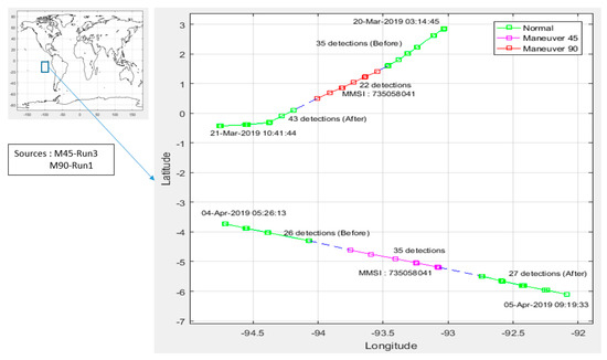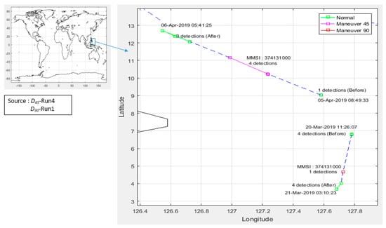 In Figure 16, in an ocean near the Philippines that has 50–60% re-detection probability, we also made a tracking of a class A ship with MMSI 374131000. This bulk carrier ship with a Panama flag was detected one time before the maneuver, four times during the 45°-maneuvered, and three times after the maneuver. This ship was detected four times before the maneuver, one time during the 90°-maneuvered and four times after the maneuver. According to this ship reception data, in the area that only has 50–60% re-detection probability, the 45°-maneuvered is also better than the 90°-maneuvered in terms of message reception performance.