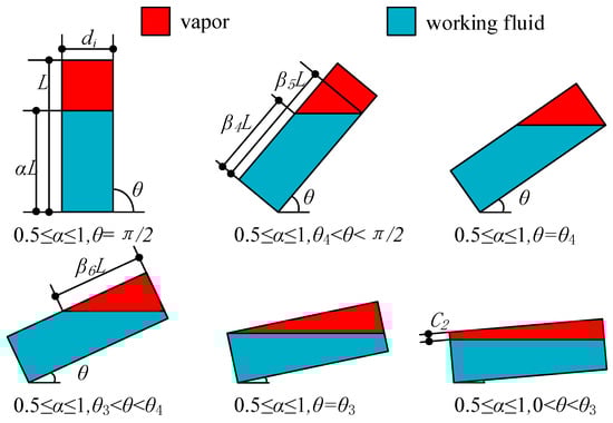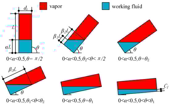 The angle between the horizontal plane and the axis direction of the thermosyphon is called the inclination angle, which has an important influence on the heat transfer characteristics of a thermosyphon under steady-state operation. The contact area between the working fluid and inner wall in the thermosyphon liquid pool is called the actual heating area. Changes in the inclination angle will cause changes in the actual heating area, thereby affecting the heat transfer characteristics of a thermosyphon. According to the different filling rates α (ratio of working fluid volume to inner volume of the thermosyphon), heating length ratios β (ratio of evaporation length to total length) and inclination angles θ (angle between the horizontal plane and the thermosyphon axis), the actual heating area of a thermosyphon is discussed in 12 cases. Figure 1 and Figure 2 are sketches of a thermosyphon and some parameters used in the theoretical derivation.