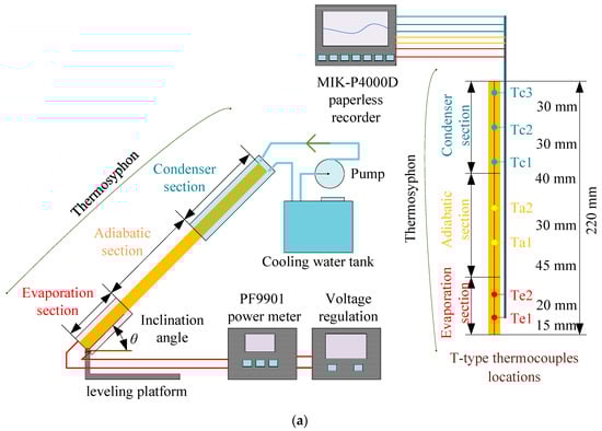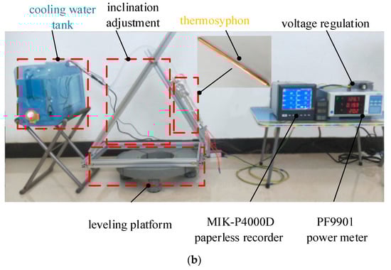 Figure 3 shows a schematic diagram of the thermosyphon experimental device and a physical diagram of the experimental device. The whole system is divided into five parts: the heating part, the heat pipe part, the cooling part, the inclination adjustment part and the temperature acquisition part. The heating part is mainly composed of a voltage regulating module, a power meter and a heating rod. The heat input is controlled by adjusting the AC voltage supply of the heating rod with an electronic voltage regulating module, and the corresponding power is determined using a PF9901 power meter. The heat pipe part and the thermocouple of the temperature acquisition part are fixed together. Seven T-type thermocouples are arranged along the axis on the outer side of the thermosyphon, and they are located 15 mm, 35 mm, 80 mm, 110 mm, 150 mm, 180 mm and 210 mm from the bottom of the thermosyphon. The specific locations are shown in Figure 3a. Temperature data are collected using an MIK-P4000D paperless recorder. In the cooling part, a circulating pump is used to drive cooling liquid circulation in the cooling water tank to cool the condensation section of the thermosyphon. By adding cold water, the temperature of cooling water is kept at 14 ± 2.4 °C. The support device of the inclination adjustment part is placed on a leveling platform to ensure that the bottom of the mechanical device equipped with the thermosyphon is in a horizontal state. The inclination of the thermosyphon relative to the horizontal plane is adjusted by changing the fixed position of the support rod. Ceramic fiber paper is wrapped on the outside of the heat pipe part to reduce heat loss and the influence of changes in the temperature of the external environment on the system.