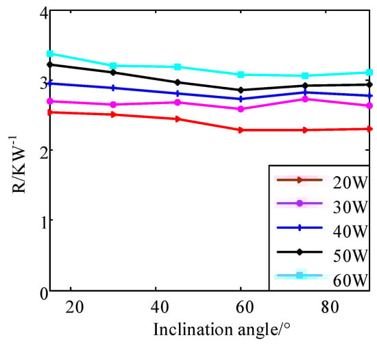 Figure 4 shows the response of the total thermal resistance with respect to the inclination angle when the thermosyphon is operating under steady-state heat transfer conditions. When the inclination angle is less than 60°, the thermal resistance of the thermosyphon decreases with increasing inclination angle. When the inclination angle is greater than 60°, the change in thermal resistance with the inclination angle is relatively slow. These phenomena occur because, when the inclination angle is small, increasing the inclination angle can obviously increase the actual heating area of the evaporation section of the thermosyphon and increase the gravitational component of the working fluid reflux. In contrast, when the inclination angle is sufficiently large, the gravitational force can provide power for working fluid reflux. Therefore, further increases in the inclination angle have little effect on thermal resistance. When the heat transfer power is 30 W, 40 W or 50 W, the thermal resistance is minimized when the inclination angle is 60°. This minimum value occurs because there is sufficient gravitational force to promote the working fluid reflux, and the stratified flow of gas and liquid avoids the rising gas obstructing the working fluid reflux. The change in thermal resistance with inclination angle is in accordance with the results already published in the literature [].