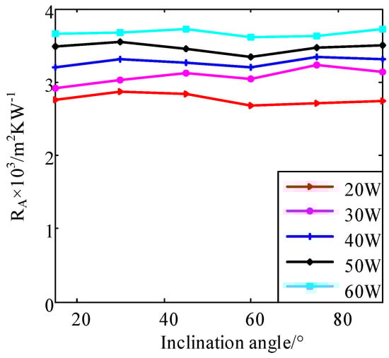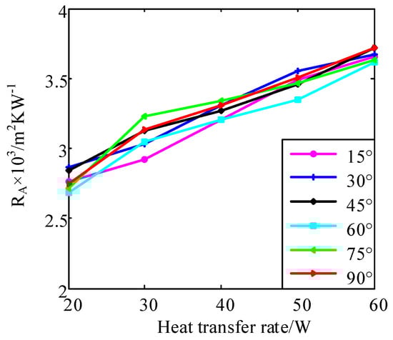 Figure 7 shows the response of the areal thermal resistance of the thermosyphon with respect to the heat transfer rate. The variations in the areal thermal resistance with respect to the heat transfer rate are consistent at all inclination angles, indicating that the working inclination angle has little effect on the areal thermal resistance. The overall trend of the areal thermal resistance of the thermosyphon is to increase with increasing heat transfer power, which is linearly related to the heat transfer rate.