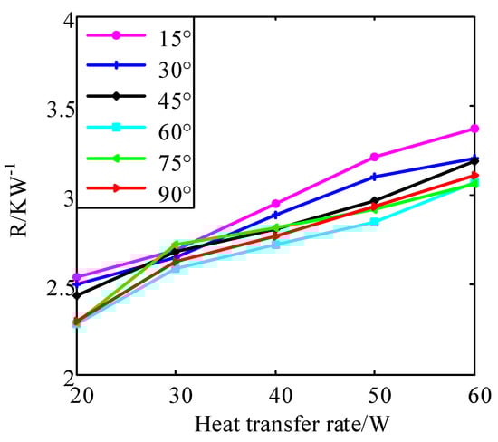 Figure 6 shows the response of the total thermal resistance of the thermosyphon with respect to the heat transfer rate under steady-state conditions. The general trend of the total thermal resistance of the thermosyphon is to increase with the increasing heat transfer rate, and the thermal resistance at an inclination angle of 15°, which is greater than those at other inclinations. This maximum value of thermal resistance occurs at 15° because the actual heating area of the thermosyphon’s evaporation section of the thermosyphon is the smallest at this angle, and the gravitational component driving the refrigerant reflux is the smallest when the inclination angle is small. This result is in accordance with the results already published in the literature [,].