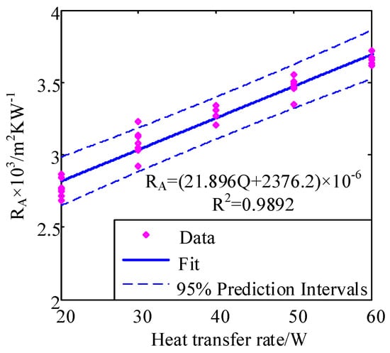 Figure 8 shows a primary curve fitting of the areal thermal resistance and heat transfer rate of the thermosyphon, which has a goodness of fit R2 of 0.9892. Two dashed lines are drawn. These lines correspond to a confidence level of 95%. The results show that the areal thermal resistance values are within the two dashed lines. Thus, the areal thermal resistance of the thermosyphon can be expressed by this fitting line when the significance level is 0.05.