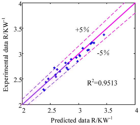 According to the fitting equation (Equation (46)), the total thermal resistance of the inclined thermosyphon is predicted and compared with the experimental values, and the results are presented in Figure 9 and Table 3. The deviations between the predicted data and the experimental data are within ±0.05, showing that the theoretical equation can accurately predict the total thermal resistance of the thermosyphon at different inclination angles.