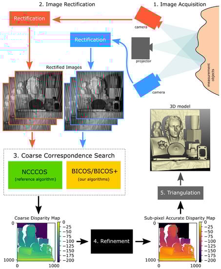 Open-source code which facilitates writing algorithms based on this approach is readily available [,]. As we work with statistical patterns, we do not have a-priori information about the projected patterns. This means that, in the coarse correspondence search (step 3), the best matching pixel needs to be searched amongst all candidates. In practice, this is the most time consuming part of the algorithm. We therefore focus on the coarse correspondence search in this paper. Its goal is to find the approximate position of the correspondence up to an accuracy of a few pixels. All further correspondence refinement (step 4) happens afterward in a separate algorithmic step where sub-pixel accuracy is achieved.