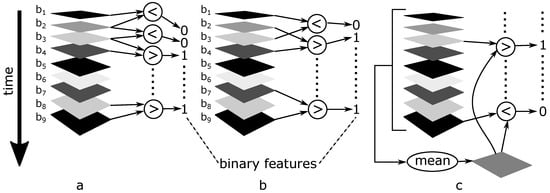 Figure 2. Creation of binary features from a pixel’s sequence of brightness values. (a) Comparison of temporally adjacent brightness values. (b) Comparison of each brightness value with every second brightness value. (c) Comparison of each brightness value with the mean brightness of the pixel (BICOS and BICOS+).We can compare every brightness value with every other brightness value within the sequence. For instance, for a sequence length of 10, we compare brightness value with , with , ..., with , with , with and so forth. This yields 45 binary features. In addition, each brightness value can be compared to the mean brightness value of the sequence, yielding another 10 binary features for a sequence length of 10 (Figure 2c). We restrict the number of binary features to 64 to allow fast computation. - 2.