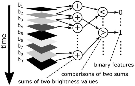 - Calculation of binary features. For each pixel, we first calculate a bit string of “binary features”. A binary feature is generated by comparing two of the brightness values of a pixel with each other (Figure 2a,b). For example, comparing brightness values with yields a binary feature with a value of 1 if and 0 otherwise. It does not matter, if a >, <, ≥ or ≤ operator is used, as long as it is consistent.