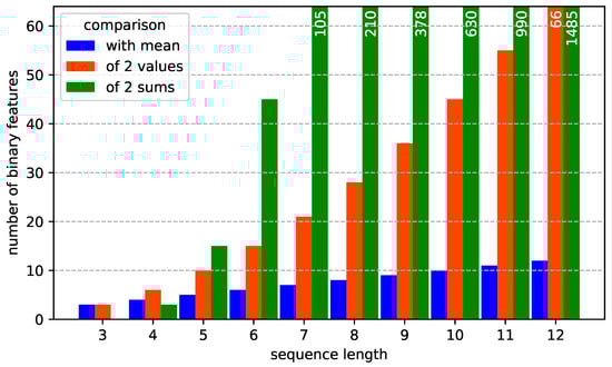 The main advantage of this method over the original BICOS is the higher number of features which can be created this way (Figure 4). Only for sequence lengths of 6 and lower this method yields less than 64 binary features. For these short sequence lengths, the missing binary features are filled up with other binary features from direct comparisons of 2 brightness values (as in the original BICOS algorithm, Figure 2a,b).