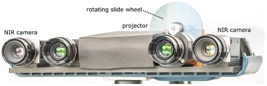 We use a 3D sensor which is composed of two near-infrared (NIR) cameras and a GOBO projector in between []. The scanner is depicted in Figure 5. The projector comprises a rotating slide wheel (GOBO) with a random binary stripe pattern, an LED illumination unit with a center frequency at 850 nm wavelength, and a projection lens. The binary stripe pattern becomes sinusoidal in the camera images due to lens blur and motion blur because the slide wheel is rotating during image integration time.