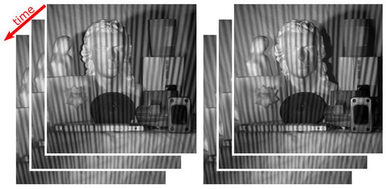 One of the most popular 3D sensor concepts is phase-shift profilometry, also called digital fringe projection with phase-shifting or phase-shift interferometry []. It is a multi-shot, coded light technique [], typically implemented with a single camera but sometimes extended with additional cameras []. The projection patterns are (periodic) sinusoidal fringes which are shifted by a fixed phase-offset with each successive projection []. Some systems project additional patterns for fringe-phase unwrapping []. Algorithms for phase-shift pattern processing are a field of high research activity [,,]. A correspondence between camera and projector can be found by decoding the brightness values of a single camera pixel. The 3D reconstruction only works on a very specific pattern sequence. In other words, information about the actually projected pattern sequence is required as an input for the reconstruction algorithm. Therefore, phase-shift profilometry (and other coded light methods) need a very well controllable and calibrated projector [].