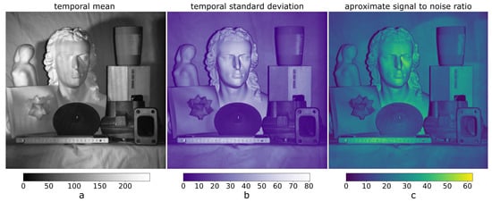 We calculated the temporal mean (Figure 9a) and temporal standard deviation (Figure 9b). The ambient light which is temporally constant is visible in the mean but not in the standard deviation. Because the NCC and the NEBF both work on temporal brightness contrast, the standard deviation represents the signal strength for the reconstruction algorithm. We looked up the noise level (as shown in Figure 6) for each pixel in the mean image. We then divided the temporal standard deviation by it. The result is an approximated signal to noise ratio (ASNR) (Figure 9c). The more ambient light, the higher the mean and therefore the higher the noise. This means that the ambient light has a negative influence on the ASNR.
