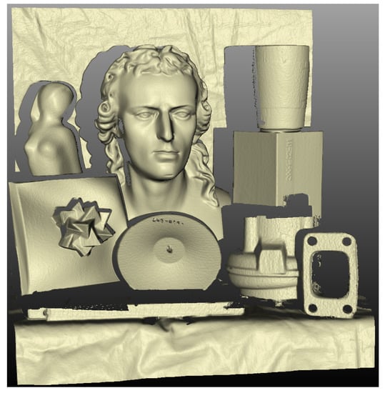 We did not asses the measurement accuracy of the final scan result in this contribution because the coarse correspondence search algorithms which we evaluated have little influence on it. The accuracy depends on the fine correspondence search which takes the coarse correspondence as an input. Schaffer et al. [] have examined similar measurement accuracies for their statistical pattern system compared with a phase shift based system used by Zhang []. In previous publications, we have demonstrated the theoretical [] and practical [] equivalence of the statistical pattern projection method with the phase shift method in terms of accuracy.