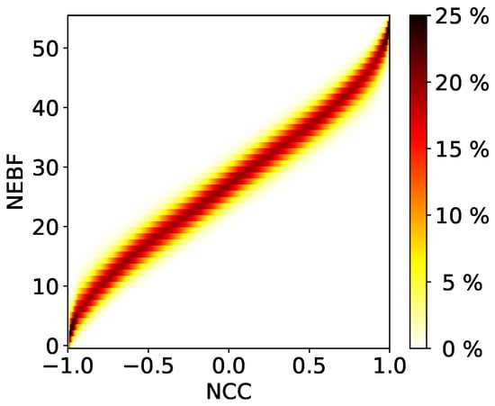 Relation between the two pixel similarity measures. 2D histogram of all pairs of normalized cross correlation (NCC) and Number of Equal Binary Features (NEBF) for all pixel comparisons of a measurement with a sequence length of 10 image pairs. For better visibility, the histogram is normed to the total number of pixels which fall in the same cross correlation bin.