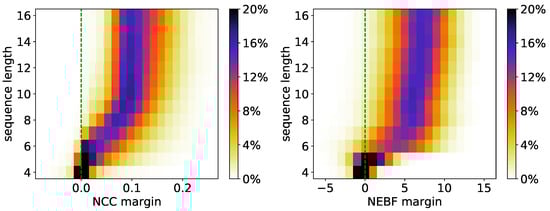 We assessed how well each of the measures (NCC and NEBF) can distinguish between the correct correspondence and wrong correspondences. We calculated the differences between the measure value at the correct correspondence (according to the ground truth) and at the most similar wrong correspondence. We call this difference NCC margin and NEBF margin, respectively. For example, for a given pixel of the left camera, the NEBF might be 62 at the correctly corresponding pixel of the right camera and the best NEBF value for any pixel which is more than two pixel away from the truly corresponding pixel might be 59; the NEBF margin is then . Large positive values mean that the true correspondence can be well distinguished from wrong correspondence candidates. Negative values mean that the wrong correspondence has a better measure value than the correct correspondence, which leads to a mismatch. It is also possible that several candidate correspondences have the same measure value (especially for the discrete NEBF). In that case, the margin is 0 and there are several equally good correspondence options. (The algorithm picks the first one. If this pick was wrong, it is likely to be removed in the reverse search. See Section 2.1.) We calculated the histograms of the margins for several sequence lengths (Figure 12).