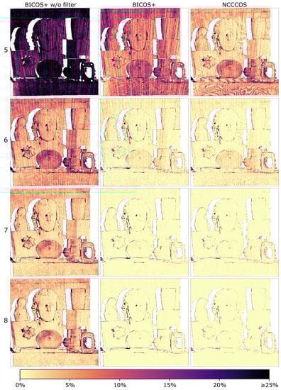 We calculated disparity maps for sequence lengths of 3 to 12, including the intermediate results before applying the median filter for BICOS(+). We compared the coarse disparity maps to the ground truth disparity. Correspondences whose disparity differs more than 2 px from the ground truth were classified as “incorrectly matched”. We show examples of which part of the test scene produces what percentage of missing or mismatched correspondences in Figure 13. In Figure 14 we show the combined percentages over the whole scene.