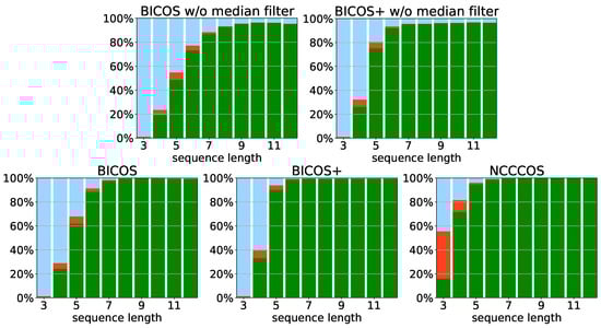 Percentage of wrong or missing correspondences (out of 39 data sets). Top to bottom: sequence lengths 5, 6, 7 and 8. Left to right: BICOS+ without median filter, BICOS+ (with median filter) and NCCCOS.