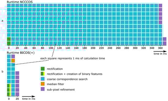 Algorithm runtime on NVIDIA GeForce 1080; each square represents one millisecond. (a) runtime of NCCCOS (reference algorithm), (b) runtime of BICOS(+).