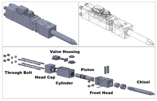 Hydraulic breakers are widely used, typically attached to excavators in heavy industries and construction for the deactivation and removal of building structures, road demolition, water supply and drainage construction, foundation works, and the destruction of quarry stones. The breaking system is composed of the main body and the bracket which houses the system. Figure 1 shows the primary components and assembly of a hydraulic breaker. The main body consists of the head cap, cylinder, front head, and valve housing. The excavators discharge the pressurized hydraulic oil into the main valve, which is located at the top of the hydraulic breaker. The cylinder moves from the top to bottom and back and forth according to the oil pressure due to differences in the cross-sectional area. Lastly, the piston impacts the chisel, which makes direct contact with the rock to break it down.