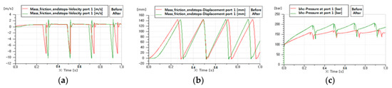 Simplified hydraulic breaker model: (a) velocity; (b) displacement; (c) pressure.