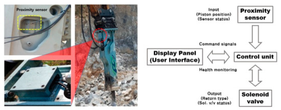 The suggested adjustable hydraulic control is mainly composed of sensors for measuring the depth of the piston (chisel) (Figure 5) and a solenoid valve for controlling the displacement of the stroke as determined by the algorithm (Figure 6). In addition, the micro control unit (MCU) for the communication and monitoring of the system in real time as well as the operation time after setting the stroke mode are shown in Figure 7.