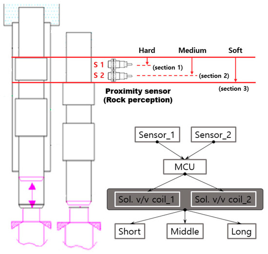 While impacting the bedrock, signals from the proximity sensor can identify that the flow line is close to the solenoid valve when the system determined that the rock is hard, and the piston is set in the long stoke range mode and retain this position.