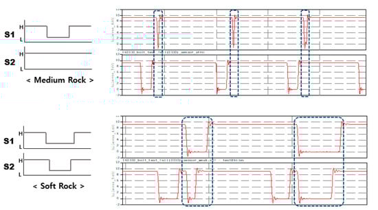 When one sensor is employed for rock property detection, for mid-strength rock it sets a medium stroke with a middle position, controlled from the solenoid valve. When two sensors are used to detect and send the signal, the controller can recognize soft rock to provide the shortest stroke. Figure 8 shows the proximity sensor data for the properties of each rock type.