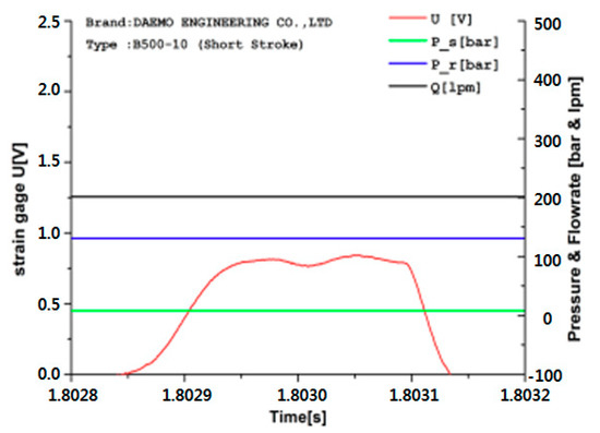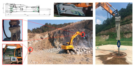 A field test was carried out to confirm the possibility of applying this system in conventional heavy industries, as shown in Figure 9. Attached to the system were the pressure sensor, flow rate sensor, temperature meter, and strain gauge. The actual experiment evaluated the performance of the hydraulic breaker in long and short stroke modes.