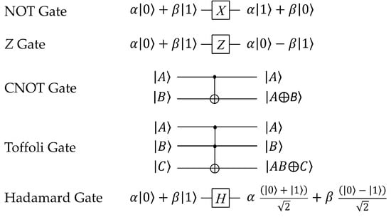 In the quantum circuit model of QC, a complex transform is broken down into simpler gates such as the commonly used NOT, Hadamard, CNOT, and Toffoli gates [] which are shown in Figure 1. A gate that acts on k qubits is usually represented by a unitary matrix, where the number of qubits in the input and output of the gate must be equal.