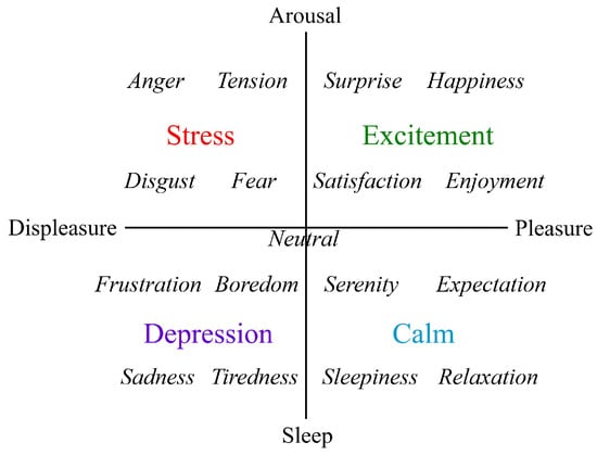 The two-dimensional PA plane is characterised by a pleasure-displeasure axis and an arousal-sleep axis, which represent not only specific emotions but general features common to many different emotions []. Moreover, unlike the expression of sensitive feelings in human communication, discussions pertaining to robot emotion are relatively straightforward. Hence, we modify the original PA plane in [] and represent it as presented in Figure 3. Furthermore, the intersection between these two axes (henceforth called the cross point) is regarded as the neutral expression from which the level of happiness will increase along the pleasure direction, and vice versa. On the arousal-sleep axis, the liveliness of a human emotion will become stronger from the cross point towards the arousal axis. As seen in the figure, there are four quadrants that are labelled as “Excitement”, “Stress”, “Depression”, and “Calm”. Since our study is focused on the robot emotion, each quadrant of the modified PA plane can be roughly divided into four key emotions as illustrated in Figure 3.