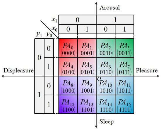 To discuss emotions in the QC realm, first, we revise the encoding of the PA plane hitherto presented in Section 2.2 by reinterpreting it in terms of the qubit sequence. Figure 4 illustrates the quantum version of PA (henceforth called QPA) plane with 16 types (or degrees) of emotions that are used to represent these emotions whose representation on the QC paradigm requires four qubits. Certainly, as the need to elicit richer and sensitive emotions increases, more qubits will be required to partition the QPA plane into additional lattices. The notation and location (i.e., representation) of each emotion is labelled in each lattice of the QPA plane, i.e., .