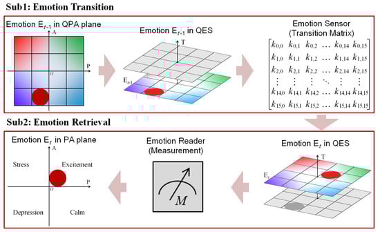In the QES, emotion transition largely depends on the stimulus from the external world (e.g., atmosphere) at any given instance. Assuming the robot’s emotion at time , i.e., , is “tiredness”, then the red dot in the first two figures in Figure 6 (i.e., Sub 1) symbolises the emotion in the QPA plane and QES. In fact, QES is the emotion space that is constructed by recovering a series of computations on the QPA planes according to the time axis. The coloured and greyscale QPA planes (in the middle of Figure 6) are used to distinguish the current emotional state from those at other instances. The ES transforms the stimulus into a corresponding emotion transition matrix (such as the operation EIO in Equation (13)). Generally, this transformation is accomplished by the tensor product operation on a set of unitary operations, e.g., quantum gates in Figure 1, and each operation is evoked using a human and/or robot that facilitate the robot’s emotion entering its next emotional state. Since four qubits are used to represent the emotional state, the corresponding emotion transition matrix will have a dimension. In the earlier example of state signifying the emotion “tiredness”, based on Equation (12), the emotional state at time would be “satisfaction”. In QES, the transformed emotion state at time , i.e., , in QES is shown in the emotion retrieval sub-unit (Sub 2) in Figure 6. Finally, the ER is used to retrieve the quantum emotion state and depict it in the traditional PA plane.