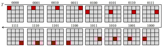 We present a simple example that tracks transitions in a robot’s emotions from (enjoyment), (tension) through to (relaxation) (as shown in Figure 7). The emotion transition matrix used at each instance can be obtained from ES (in Section 4.1). There are 16 QPA planes where, in each plane, the red block indicates the emotion at that instant. Each emotion depicted in the plane is consistent with the contents presented earlier in Table 2. In the QES framework, quantum emotion manipulation is achieved by using the transition matrix to transform each emotion state as shown in the quantum circuit that implements the entire manipulation process is presented in Figure 8.