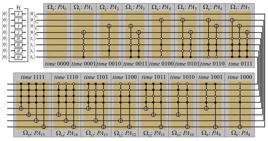From the layout of the QES presented in the preceding sections, we see that eight qubits are required to construct the robot’s QES model; for this example, out of this number, four qubits are used to encode the information about emotion (i.e., QPA plane) and four qubits are employed to encode the temporal information about the emotion transition. The symbol used in Figure 8 represents the operation that implements the initialisation process from as presented in Equation (18), whereas the operator is used to transform the current emotion to its next state as described in Section 4.2. Meanwhile, the notation signifies the type of emotion (as presented in Table 2), where . As seen in the circuit construction for this example (in Figure 8), 32 multi-input CNOT gates are used to transform the robot’s emotional state from its initial state, i.e., , to the final state, i.e., .